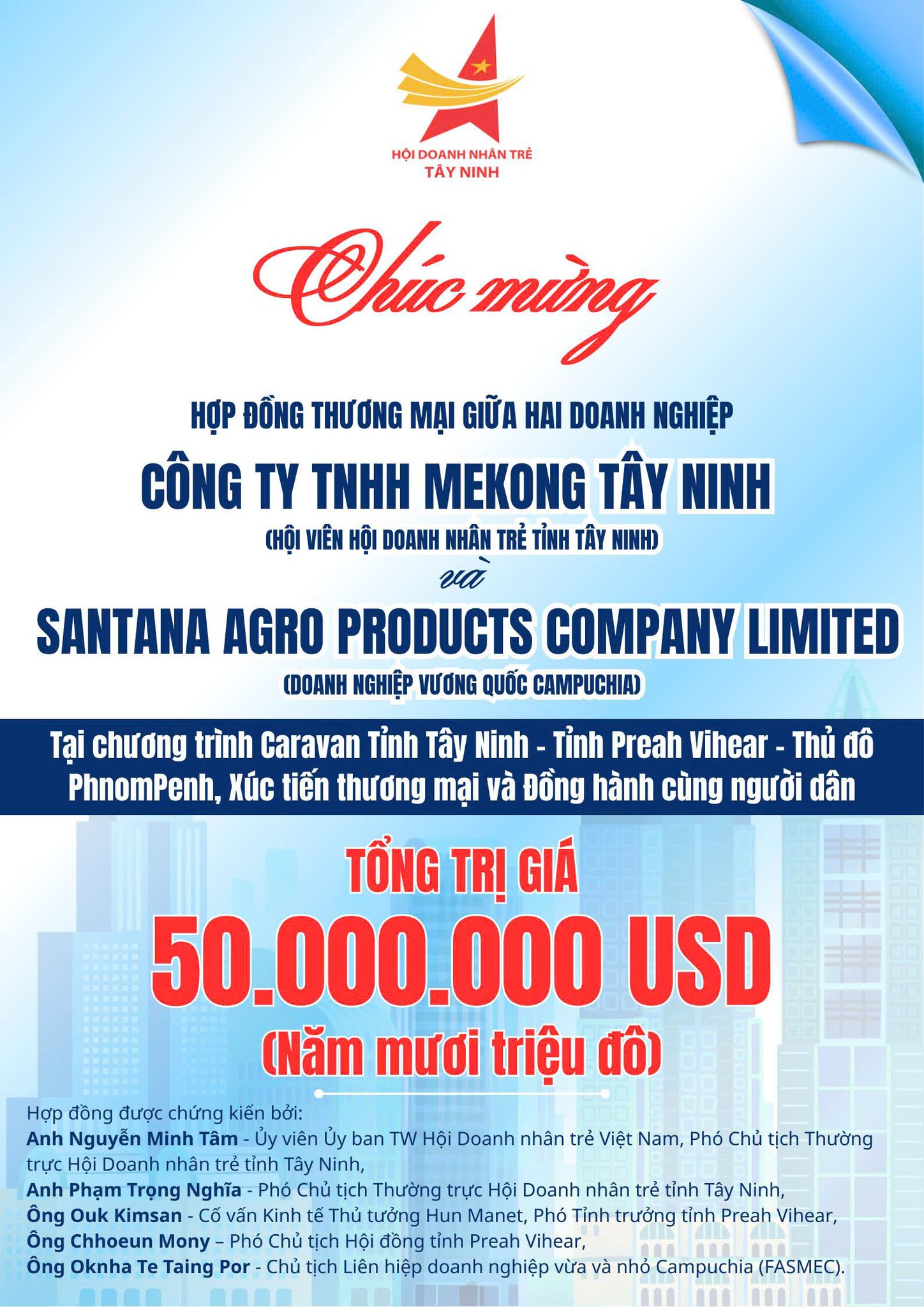 Hội Doanh nhân trẻ tỉnh Tây Ninh trân trọng chúc mừng Công ty TNHH Mekong Tây Ninh (Hội viên Hội Doanh nhân trẻ tỉnh Tây Ninh) và Santana Agro Products Company Limited (Doanh nghiệp Campuchia) đã ký kết thành công hợp đồng thương mại trị giá